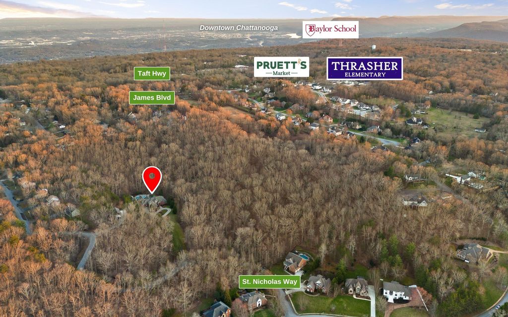WATCH VIDEO: https://youtu.be/ODq1lKLXi_0 - SECLUDED ACREAGE ESTATE Nestled on 18+/- acres in the heart of Signal Mountain, this stunning estate offers an unparalleled blend of elegance, comfort, and entertainment. This hidden gem is within 5 minutes of Signal Mountain's town center. Designed for those who value both privacy and refined living, this 7 bedroom residence is a masterpiece of craftsmanship and luxury. The lengthy driveway sets the tone for the exclusivity this home offers. Step through the arched entryway into a grand foyer filled with natural light, leading to an open living and dining area with breathtaking views of the backyard sanctuary. A private executive office with custom built-ins provides the perfect workspace to maximize EPB Fiber Optics gig speed internet. The GOURMET KITCHEN is a chef's dream, featuring Sub-Zero and Viking appliances, granite countertops, custom cabinetry, and large island. The adjoining Great Room boasts a magnificent fireplace, wood-planked ceilings, and impressive bar--perfect for hosting. Outdoor living is just as impressive with a covered patio overlooking a HEATED POOL, hot tub, resort-style slide, and a soothing creek. Dedicated poolhouse with full bath ensures convenience and easy entertaining. The main-level primary suite is a retreat of its own, offering a fireplace, spa-like bathroom, laundry room, and custom walk-in closets. Upstairs, 4 spacious bedrooms, 3 baths, bonus room, and second laundry provide ample space. Daylight basement includes a HOME THEATER, kitchen, laundry room, in-law suite, and game room. A detached 4-CAR GARAGE is the perfect WORKSHOP, while the expansive wooded acreage offers elbow room and serenity. Residents enjoy local amenities including The Bread Basket, Ace Hardware, Pumpkin Patch Playground, and Signal Mountain Town Center with Pruett's Market and dining. Zoned for award-winning school zones: Thrasher Elementary and Signal Mountain Middle/High School. Embrace the East TN outdoor lifestyle within 15 minutes of North Chickamauga Creek Gorge State Park, Rainbow Lake, and Edward's Point. 25 minutes to Downtown Chattanooga's restaurants, medical facilities, and cultural attractions. Centrally-located Chattanooga is easily accessible to Nashville, Knoxville, Atlanta, Birmingham and beyond. A true Signal Mountain gem, this estate is the perfect blend of luxury, warmth, and timeless charm. (Note new lot lines on recorded plat. Buyer to verify square footage. Some images may be virtually staged. Buyer is responsible to do their due diligence to verify that all information is correct, accurate and for obtaining any and all restrictions for the property deemed important to Buyer.)