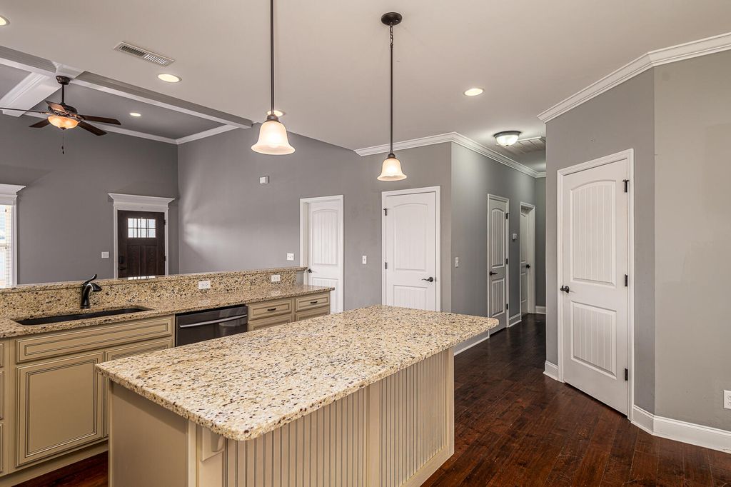 | INTERIOR | Breakfast Bar, Ceiling Fan(s), Coffered Ceiling(s), Crown Molding, Eat-in Kitchen, Granite Counters, High Ceilings, Kitchen Island, Master Downstairs, Open Floorplan, Pantry, Recessed Lighting, Walk-In Closet(s) |