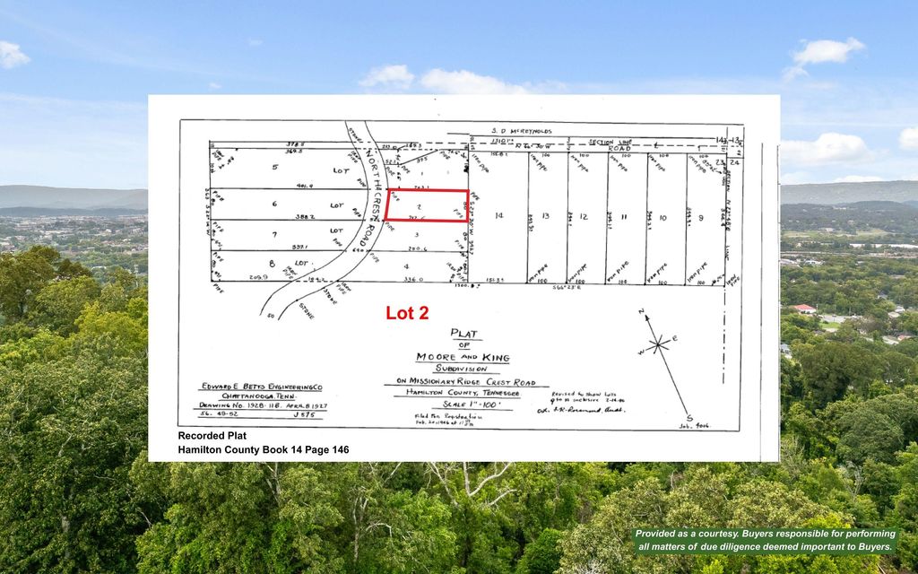 RARE HOME SITE on historic Missionary Ridge! Build your custom home with stunning panoramic VIEWS of downtown Chattanooga, the Tennessee River, Signal Mountain, Lookout Mountain and more. Partially cleared and gently sloping lot spans .38 +/- ACRES. Imagine watching the sun rise over a distant skyline while your morning coffee brews. Enjoy the sunset over the Tennessee River and Chattanooga from your living room or rooftop patio. Further protect your VIEW: inquire about the adjacent land on the west side of N. Crest Road. CONVENIENT location is just 10 minutes from downtown Chattanooga, Erlanger and Memorial Hospitals. Within 10 minutes of UT Chattanooga, Notre Dame High School, and McCallie School. Incredibly easy access to I-75, I-24, shopping, dining, and all the Scenic City has to offer. EPB Fiber Optics, power and water available on N. Crest Road. SEWER connectivity via easement to Cabin Road (Purchaser to confirm). A rare homesite on historic Missionary Ridge is ready for your vision! Opportunities to build on Missionary Ridge's storied corridor are exceedingly rare. This is more than a lot...it's a canvas for a legacy home in one of Chattanooga's most desirable and historic vantage points. (Expand your footprint with the neighboring corner lot: Inquire about 262 N Crest Road. Any and all property lines on photos are simulated and are approximate. Buyer is responsible to do their due diligence to verify that all information is correct, accurate and for obtaining any and all restrictions for the property deemed important to Buyer.)