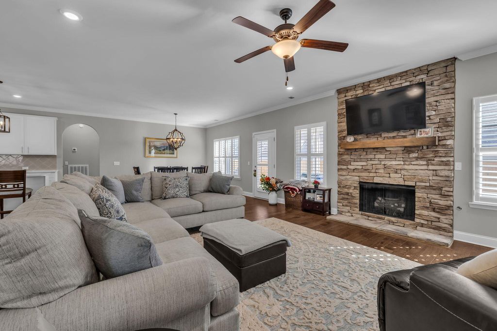 From the moment you arrive, you'll be captivated by this home's timeless character and curb appeal. Step inside and you'll immediately notice the thoughtful details throughout "” graceful arched entryways, elegant crown molding, recessed lighting, and classic plantation shutters. The kitchen is truly a dream, featuring beautiful granite countertops, a large eat-at island, a spacious pantry, stylish tile backsplash, stainless steel appliances, and an abundance of cabinet and counter space "” perfect for cooking or gathering with friends and family. The open great room offers tall ceilings and a stunning stacked-stone fireplace, seamlessly flowing into the dining area for easy entertaining. A formal dining room provides the perfect space for hosting special meals and celebrations. The split-bedroom floor plan ensures privacy, with a generous primary suite that includes a large walk-in closet and a beautifully designed bath with tile flooring, a roomy tiled shower, and dual sinks. The additional bedrooms are large and bright, offering plenty of space for family or guests along with excellent closet storage. Upstairs, you'll find a versatile bonus room that could be used as a 4th bedroom, media room, or playroom, along with a third full bath and convenient walk-out storage. Step outside to your covered back patio "” the perfect spot to relax and enjoy the level, fenced backyard. This home truly combines comfort, charm, and functionality in one beautiful package.