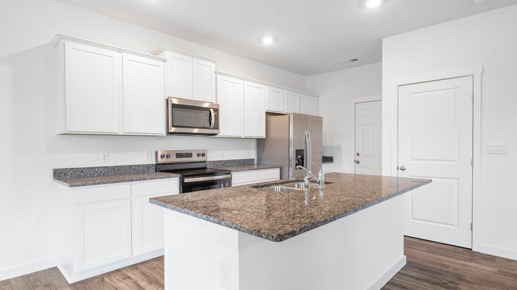The Edmon plan available at The Cove at Thrasher Landing in Hixson, TN is a charming floorplan suited for any stage in life. The foyer opens to an expansive open concept living area and kitchen. The kitchen includes an island with countertop seating, a pantry, and a breakfast nook. The living and kitchen areas overlook an outdoor patio. Upstairs are four spacious bedrooms and two full bathrooms. The primary bedroom features a walk-in closet and en suite bathroom. The upstairs also features a laundry room.