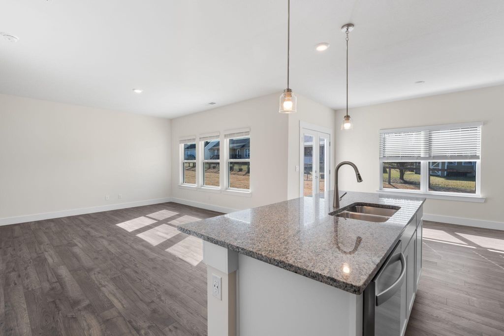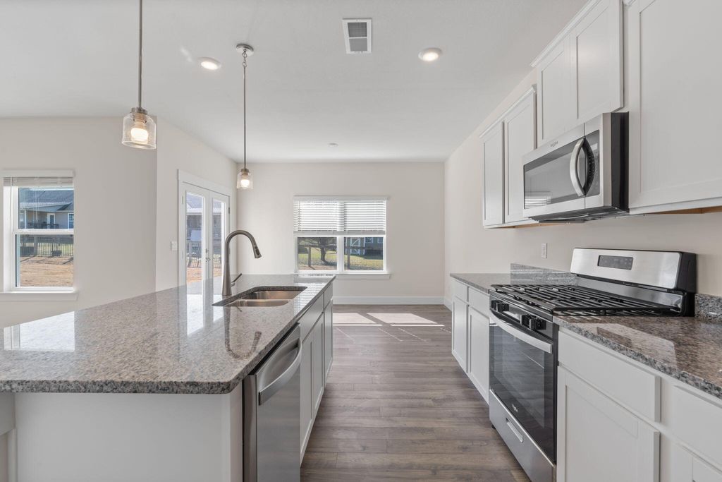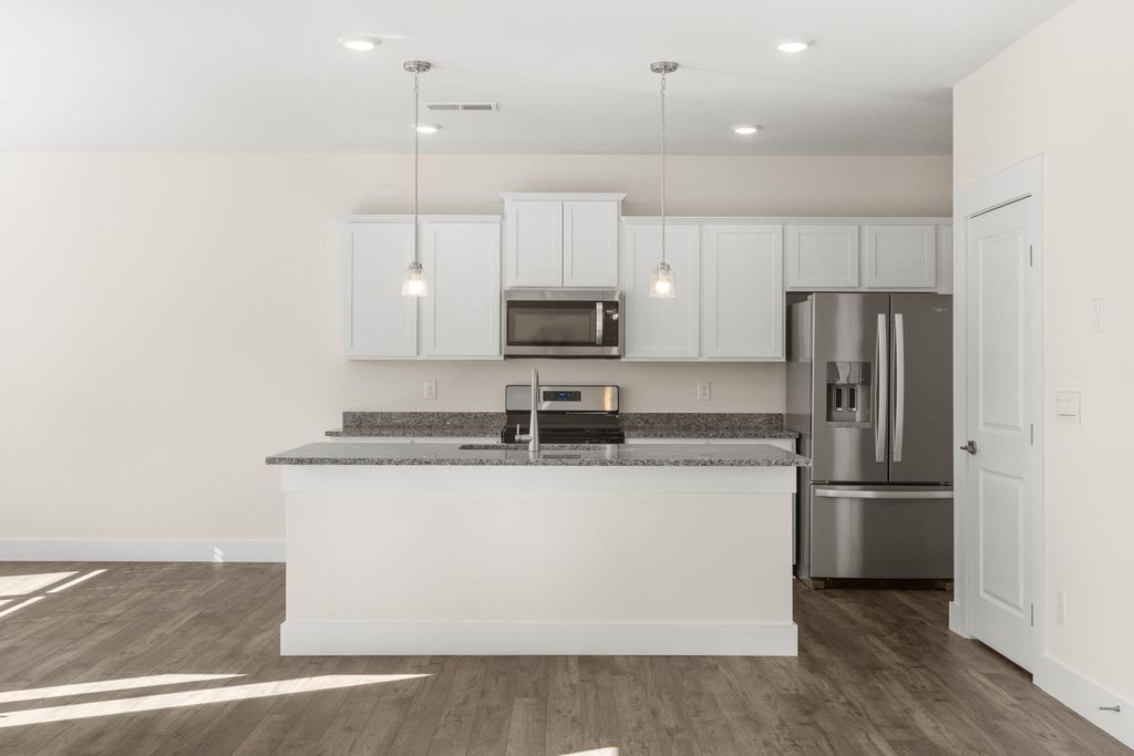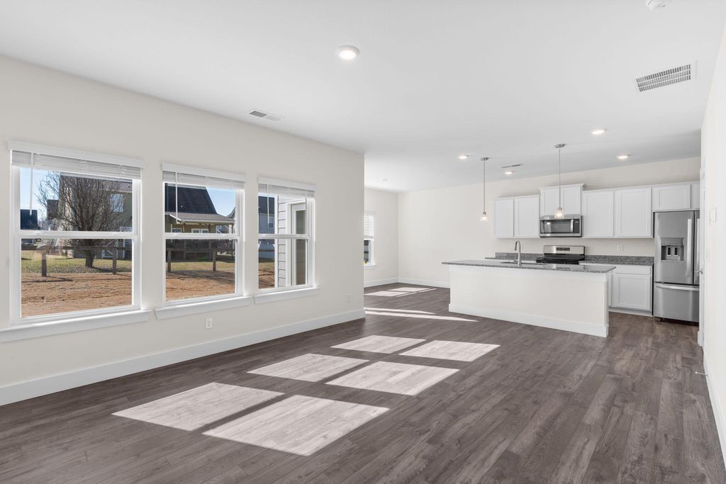 The Edmon plan available at The Cove in Thrasher Landing in Hixson, TN is a charming floorplan suited for any stage in life. The foyer opens to an expansive open concept living area and kitchen. The kitchen includes an island with countertop seating, a pantry, and a breakfast nook. The living and kitchen areas overlook an outdoor patio. Upstairs are four spacious bedrooms and two full bathrooms. The primary bedroom features a walk-in closet and en suite bathroom. The upstairs also features a laundry room.
