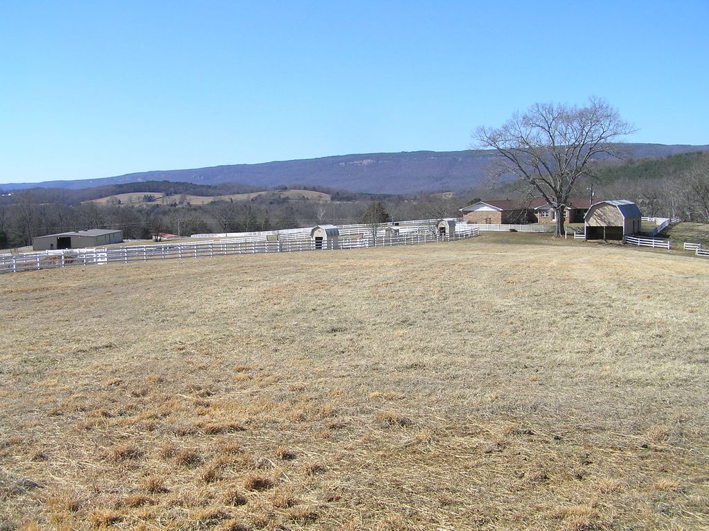 66 acres fenced and cross fenced with 9 pastures. 70x140 (9,800 Sq FT) barn with tack room and vet space and it has power and water. An additional 24x48 horse barn with stalls and two individual horse barns. 12x20 and 16x30 equipment sheds. The property has a spring and year-round creek, and you own both sides, and a cattle pond. It has been used as part of a commercial cattle operation. It is a mixture of hay fields, pasture and woods with lots of wildlife. You have panoramic views of the mountains from the house and most of the property for several miles. You are close to state parks and TVA lakes and there is a spot I have put canoes in the Sequatchie river across the road. The house is brick with 12 rooms, 4 Bedrooms and 3 full baths., and the master has a walk in closet and jetted tub. Living room has a fireplace with gas logs. The den has an indoor grill. 2 car garage (1305 Sq Ft) full finished, with 3 locking storage rooms. A18x60 wood deck with a handicap ramp and a 15x12 patio. If are looking for a farm or need lots of storage space the large barn would be great for construction equipment. It is very difficult to find property on East Valley since most properties have been passed from one generation to the next since the early 1800's. It is in greenbelt, so taxes are low. You have 1270 feet of paved road frontage on East valley Rd.
