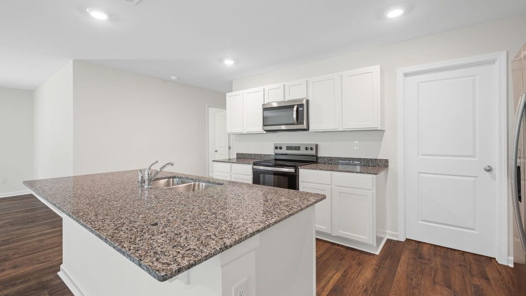 The Edmon plan available at [COMMUNTIY NAME] in [AREA] is a charming floorplan suited for any stage in life. The foyer opens to an expansive open concept living area and kitchen. The kitchen includes an island with countertop seating, a pantry, and a breakfast nook. The living and kitchen areas overlook an outdoor patio. Upstairs are four spacious bedrooms and two full bathrooms. The primary bedroom features a walk-in closet and en suite bathroom. The upstairs also features a laundry room.