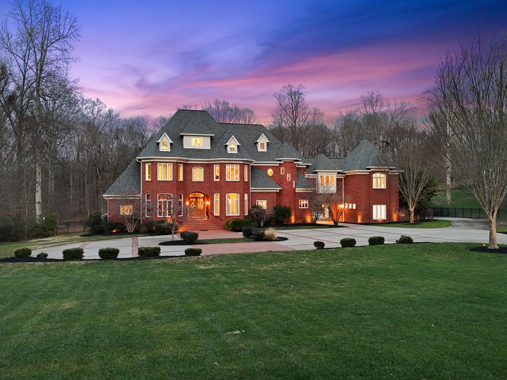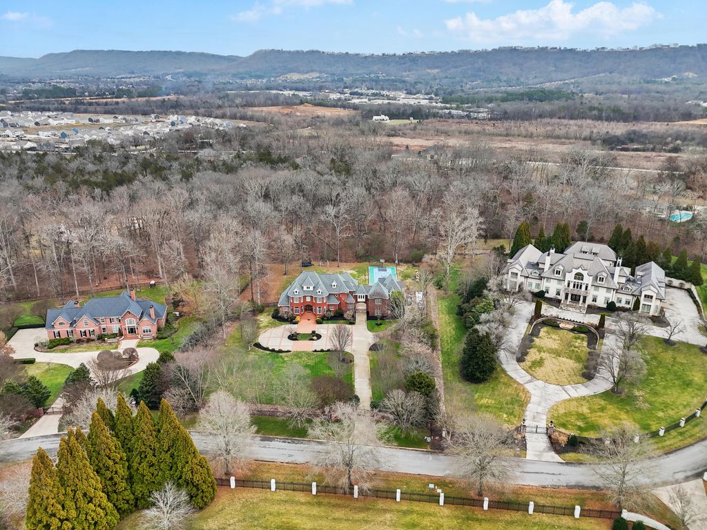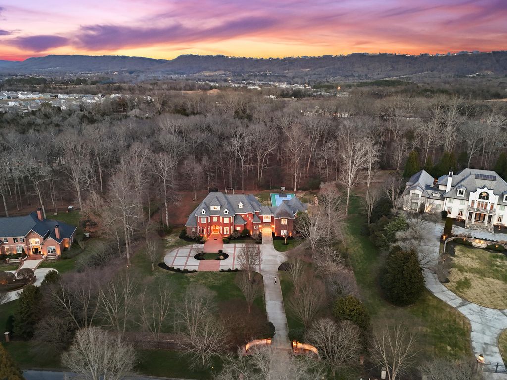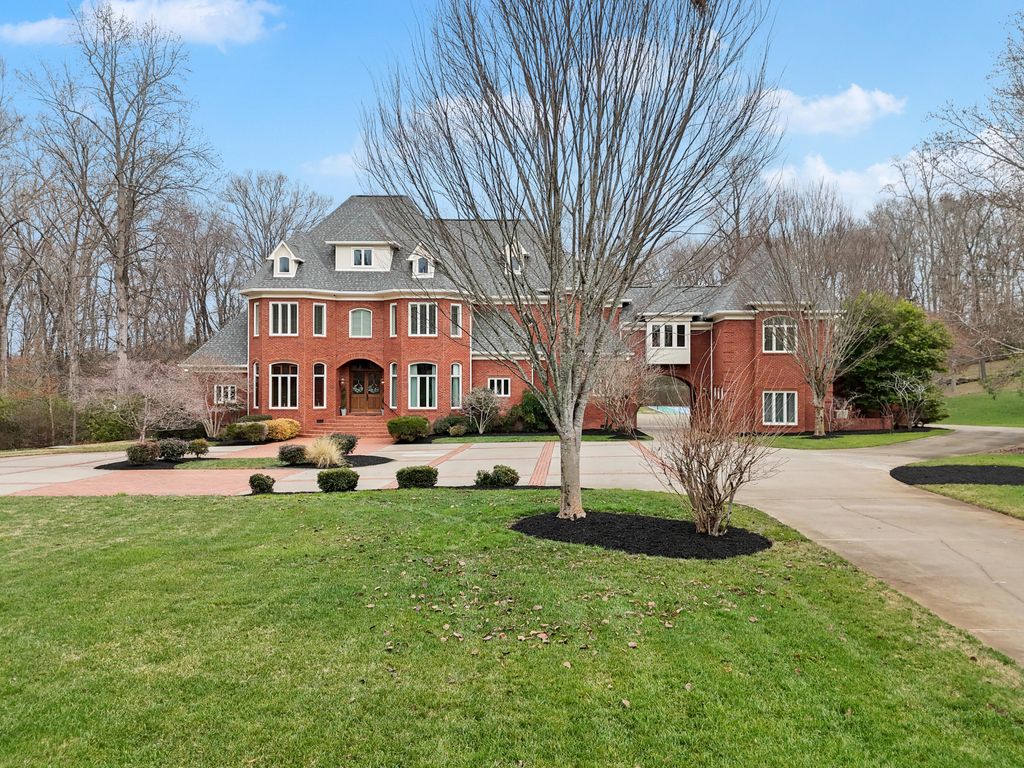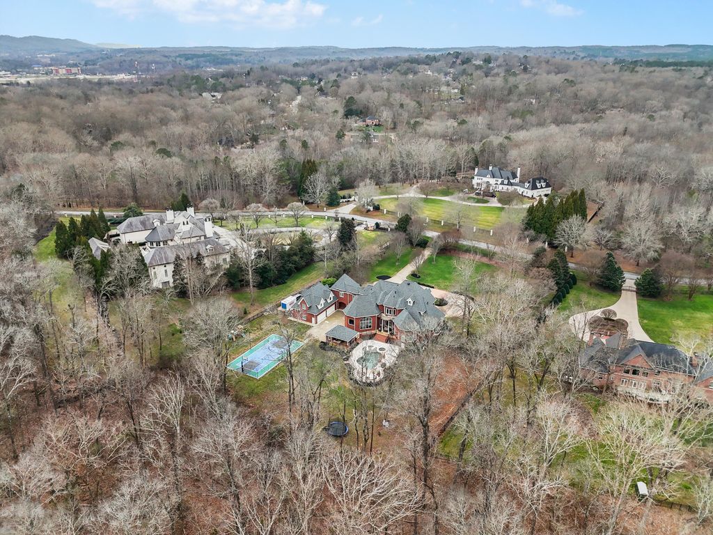 Welcome home to 8831 Forest Creek Ln. A gated estate in a private neighborhood, and only minutes from the interstate, this genuine intersection of luxury, pragmatism and convenience is rarely configured, and even harder to find. Behind the stately brick wall along the road lies a 3 acre property and home that is striking both inside and out. The European inspired facade features multiple gables and a dramatic turret-style tower that adds unique architectural charm. The asymmetry of the attached garage and guest house, connected to the main structure by a breezeway, grounds the executive home and provides a continuation of depth to the structure's position. The red brick exterior nods to the timelessness and durability of such an estate. The well maintained lawn, mature trees, brick inlaid circular driveway, and the grand central entrance with arched brick detailing signal the welcome of a carefully maintained and inviting abode. Just inside the main entrance of the home, a grand foyer awaits. A raised platform and marble tile welcome you into a home of this kind and quality. On the left is the epitome of a study or home office. Inlaid panels, a fireplace, fluted trim, crown molding, coffered ceiling, plantation shutters and wide baseboards are all finished in rich oak. A dancing fire on a rainy day, or the bright sunlight let in by the surrounding windows are sure to create an atmosphere attuned to study, creativity, and musing. After stepping down from the dias, the home opens up to a large dining area, grand staircase on the left and keeping room to the right. In the original plans, these two spaces were swapped, but the sellers have thoughtfully chosen to use these spaces as they currently function - a contained keeping room beautifully arranged with custom seating, ample sunlight, and the custom hand painted inset ceiling - and the large dining area, capacious and sizeable, with plenty of room for entertaining, milling about, and for serving a large gathering. This space continues to the right of the home into the family gathering room. A high, cathedral ceiling, highlighted by the tall stone fireplace and the exquisite picture window that overlooks the backyard at once makes the space feel grand and cozy, if those two words could find meaning in adjacent places. The warmth of the rich wood tones in the gleaming hardwoods that stretch throughout the home, the stone fireplace that anchors the space, and the oversized window and light colored walls and cream accents offer such a juxtaposition. This is a space that feels like it belongs to such an estate, but also feels lived in and well loved. The luxury kitchen is just off of the family room. The custom inset vented range enclave sets the tone for this space. Elevated, unique, and engineered towards simple luxury, this kitchen is perfect for hosting, for daily use, and for entertaining friends that have come over to chat. The custom cabinetry, built by renowned Chattanooga cabinet maker, Mike Norcia and Norcia fine cabinetry, anchor these luxury spaces and serve as the backdrop for the real magic that happens in a space like this: when people gather. The Subzero fridge in its own custom surround, Cove dishwasher, Viking microwave, and 48" six burner Monagram Range continue to tell the story of this home: understated luxury that functions as easily as it shows. Additionally, these appliances are less than 2 years old. A mud area, large laundry room, half bath, a wet bar with more storage and its own separate dishwasher, and back staircase all make up the remaining right side of the home. These spaces are also well appointed visually and complete each need that could be imagined in a home like this. On the left side of the main floor, you'll find the primary suite. The bedroom features incredible coffered ceilings, another gas fireplace, a convenient walkout covered patio area, and plenty of space for a sitting area. The large primary bathroom is the showpiece of this