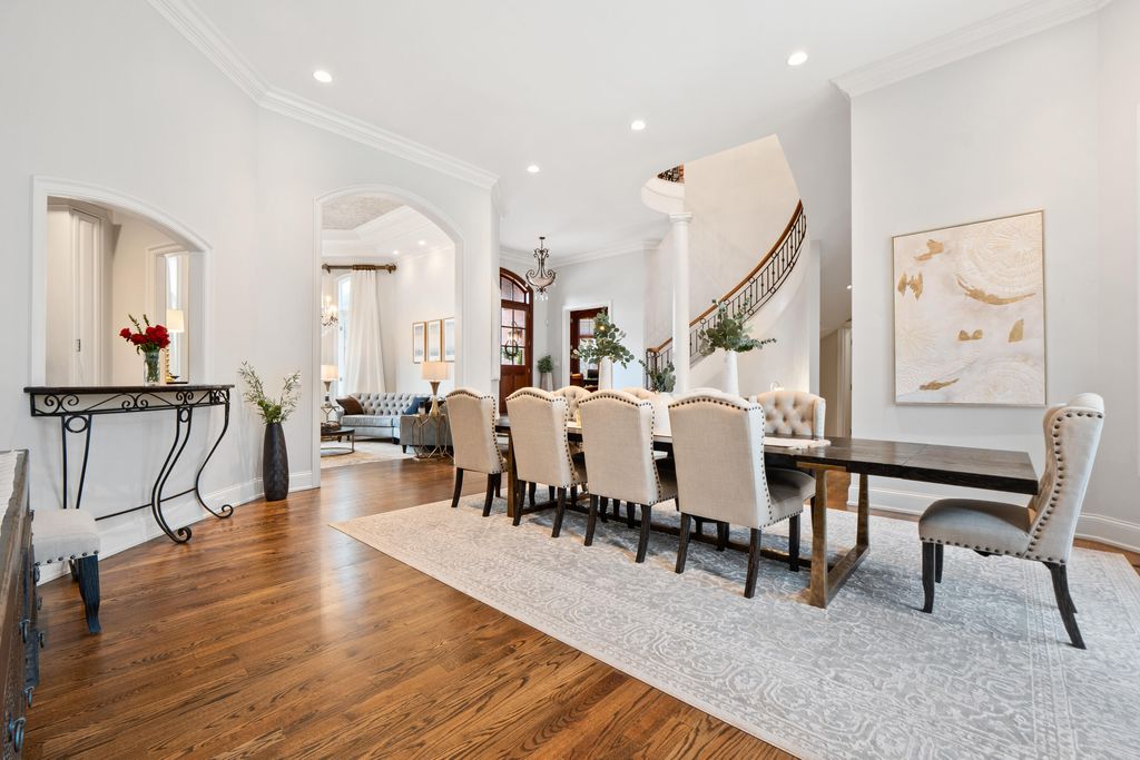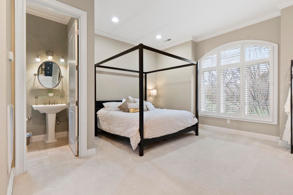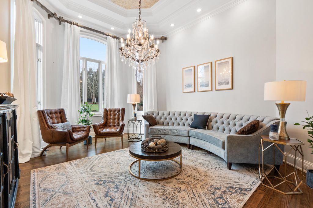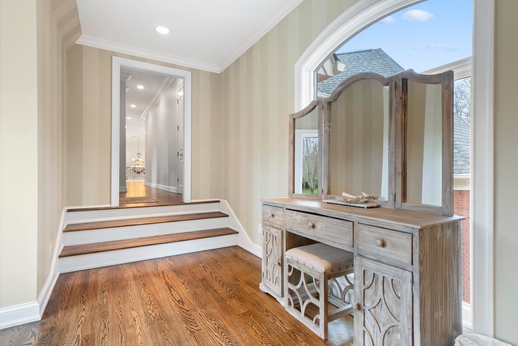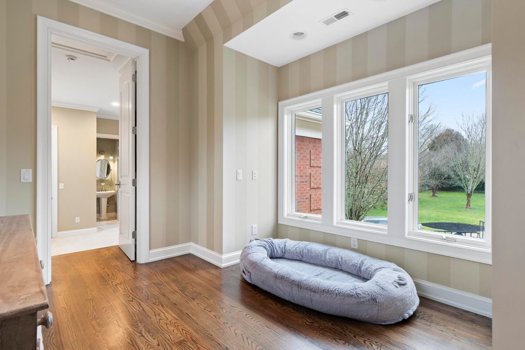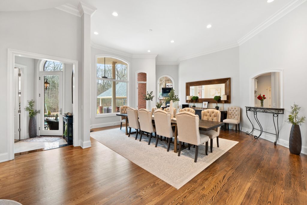Welcome home to 8831 Forest Creek Ln. A gated estate in a private neighborhood, and only minutes from the interstate, this genuine intersection of luxury, pragmatism and convenience is rarely configured, and even harder to find. Behind the stately brick wall along the road lies a 3 acre property and home that is striking both inside and out. The European inspired facade features multiple gables and a dramatic turret-style tower that adds unique architectural charm. The asymmetry of the attached garage and guest house, connected to the main structure by a breezeway, grounds the executive home and provides a continuation of depth to the structure's position. The red brick exterior nods to the timelessness and durability of such an estate. The well maintained lawn, mature trees, brick inlaid circular driveway, and the grand central entrance with arched brick detailing signal the welcome of a carefully maintained and inviting abode. Just inside the main entrance of the home, a grand foyer awaits. A raised platform and marble tile welcome you into a home of this kind and quality. On the left is the epitome of a study or home office. Inlaid panels, a fireplace, fluted trim, crown molding, coffered ceiling, plantation shutters and wide baseboards are all finished in rich oak. A dancing fire on a rainy day, or the bright sunlight let in by the surrounding windows are sure to create an atmosphere attuned to study, creativity, and musing. After stepping down from the dias, the home opens up to a large dining area, grand staircase on the left and keeping room to the right. In the original plans, these two spaces were swapped, but the sellers have thoughtfully chosen to use these spaces as they currently function - a contained keeping room beautifully arranged with custom seating, ample sunlight, and the custom hand painted inset ceiling - and the large dining area, capacious and sizeable, with plenty of room for entertaining, milling about, and for serving a large gathering. This space continues to the right of the home into the family gathering room. A high, cathedral ceiling, highlighted by the tall stone fireplace and the exquisite picture window that overlooks the backyard at once makes the space feel grand and cozy, if those two words could find meaning in adjacent places. The warmth of the rich wood tones in the gleaming hardwoods that stretch throughout the home, the stone fireplace that anchors the space, and the oversized window and light colored walls and cream accents offer such a juxtaposition. This is a space that feels like it belongs to such an estate, but also feels lived in and well loved. The luxury kitchen is just off of the family room. The custom inset vented range enclave sets the tone for this space. Elevated, unique, and engineered towards simple luxury, this kitchen is perfect for hosting, for daily use, and for entertaining friends that have come over to chat. The custom cabinetry, built by renowned Chattanooga cabinet maker, Mike Norcia and Norcia fine cabinetry, anchor these luxury spaces and serve as the backdrop for the real magic that happens in a space like this: when people gather. The Subzero fridge in its own custom surround, Cove dishwasher, Viking microwave, and 48" six burner Monagram Range continue to tell the story of this home: understated luxury that functions as easily as it shows. Additionally, these appliances are less than 2 years old. A mud area, large laundry room, half bath, a wet bar with more storage and its own separate dishwasher, and back staircase all make up the remaining right side of the home. These spaces are also well appointed visually and complete each need that could be imagined in a home like this. On the left side of the main floor, you'll find the primary suite. The bedroom features incredible coffered ceilings, another gas fireplace, a convenient walkout covered patio area, and plenty of space for a sitting area. The large primary bathroom is the showpiece of this