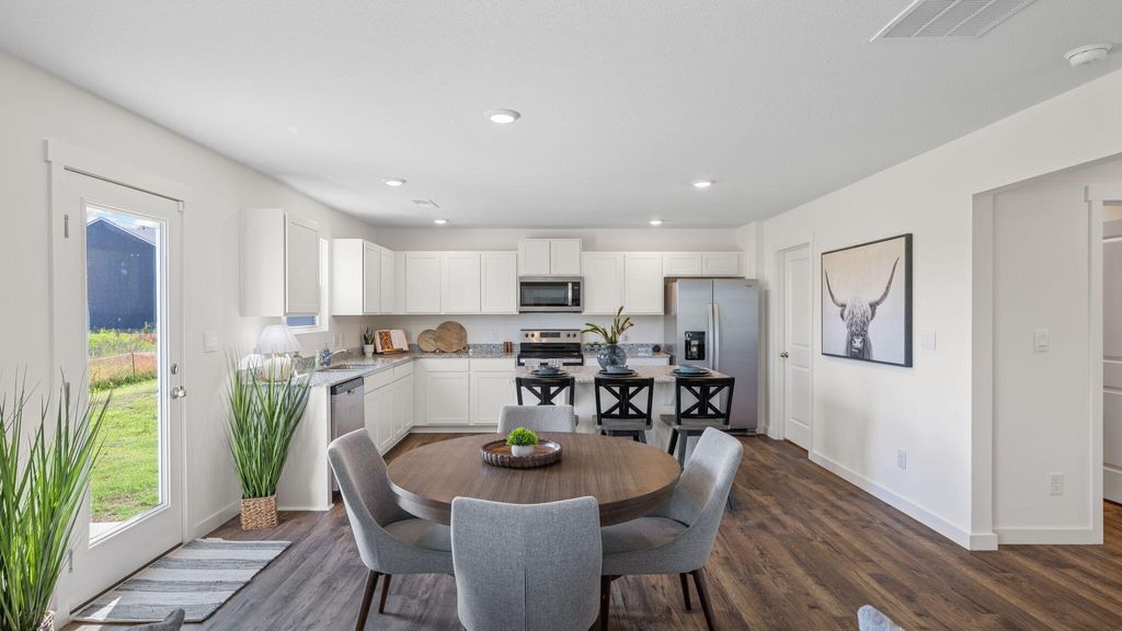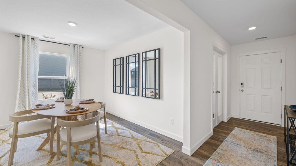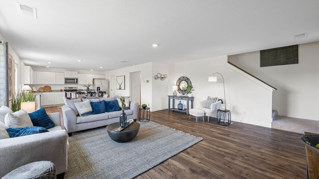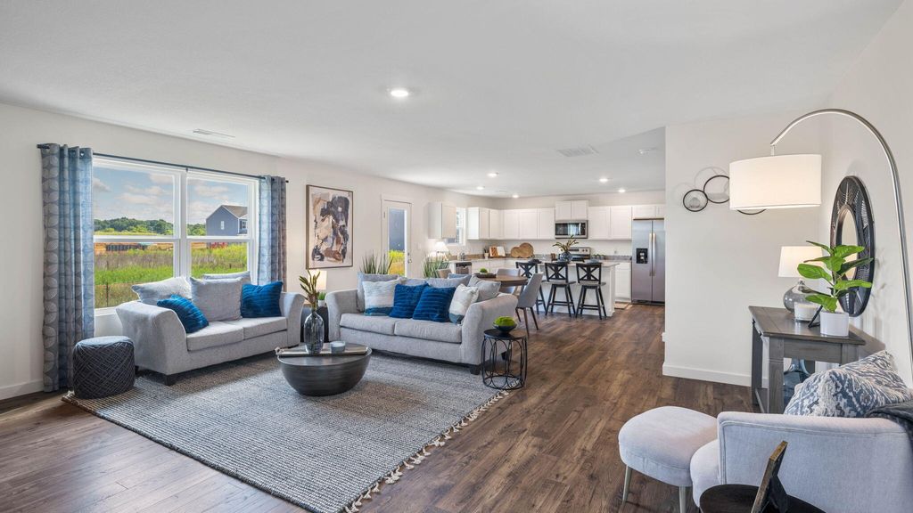 The Hanover floorplan available at Hawks Landing in Apison, TN is one of our most popular floorplans. The foyer opens into an open concept main level. A large kitchen with a pantry and island with countertop seating overlooks a dining and living area. The downstairs also features a half bathroom and a flex room that could be used as a formal dining space or an office. Upstairs is a loft which provides extra space for work and play. The primary bedroom has a private bathroom and walk-in closet. Three additional bedrooms share a comfortable bathroom. There is also a laundry room upstairs for convenience. This floorplan is designed for any stage of life.