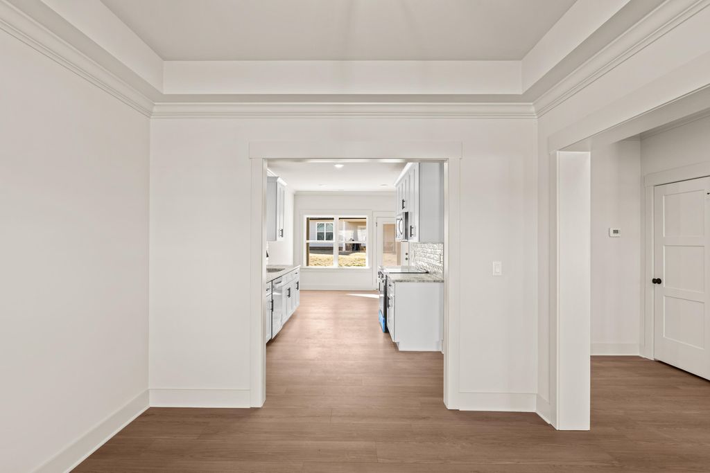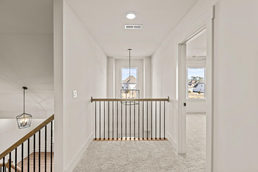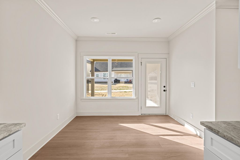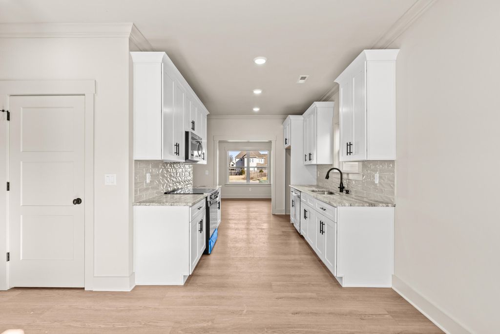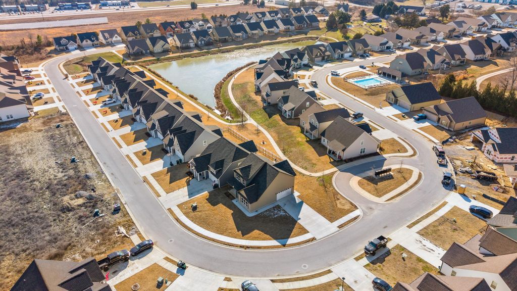 Open House Sunday 2-4pm! Discover modern comfort in The Grove, a highly convenient Ringgold neighborhood zoned for sought-after Heritage schools: Battlefield Elementary, Heritage Middle, and Heritage High (buyer to verify schools and features). This brand-new, 3-bedroom, 2.5-bath home sits on a desirable corner lot and offers 1,875 square feet of thoughtfully designed living space. Enjoy covered front and back porches with brick accents, low-maintenance fiber cement siding, low-E vinyl windows, a zero-entry raised slab foundation, and a fully sodded, landscaped yard. Nestled in a charming, sidewalk-lined community, residents benefit from a swimming pool, scenic pond, and extensive walking paths. Commuting is effortless - just 2.7 miles to I-75 at Battlefield Parkway, approximately 19 minutes to downtown Chattanooga, and 23 minutes to Dalton. Step inside to a welcoming Great Room featuring a vaulted ceiling and durable, waterproof, scratch-resistant luxury vinyl plank flooring that flows seamlessly into the Kitchen and Dining areas. The well-appointed Kitchen includes granite countertops, a stainless steel sink, Whirlpool stainless steel appliances, soft-close cabinetry, a generous pantry, and a stylish Zillege tiled backsplash. An adjacent breakfast area opens directly to the covered back porch - perfect for outdoor relaxation. Upstairs, the primary suite impresses with a double-tray ceiling, a spacious walk-in closet, and a luxurious ensuite bath boasting an oversized tiled shower, 6-foot soaking tub, Delta fixtures, and quartz countertops. Bedrooms 2 and 3 share a large hall bath with a double-sink vanity, while the convenient upstairs laundry room adds everyday ease. This floor plan stands out with generously sized bedrooms and closets...offering more space than many comparable homes. Plus a builder's new home warranty for complete peace of mind! Unwind on your back porch with picturesque sunsets over the community pond, or explore the neighborhood's walking paths. Move-in ready and blending warmth, style, and community charmthis home is waiting for you. Ask about our new homebuyer program that make it easy to go from renting to owning! Schedule your private tour today!