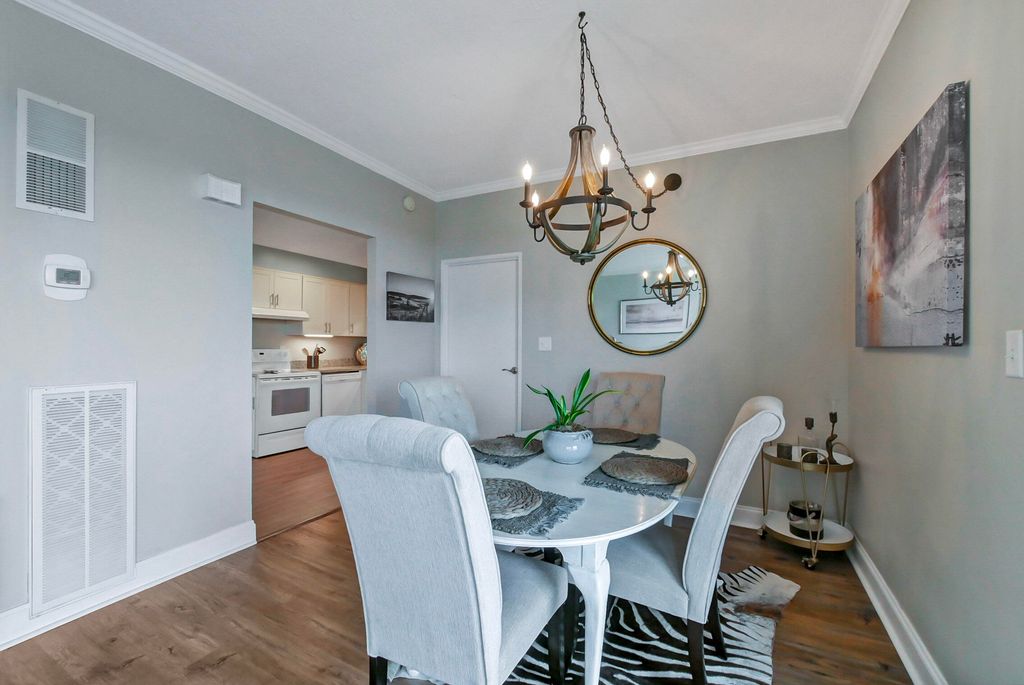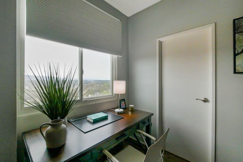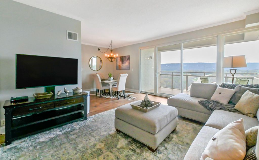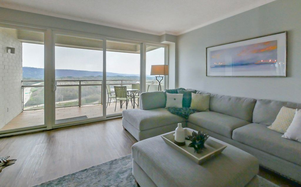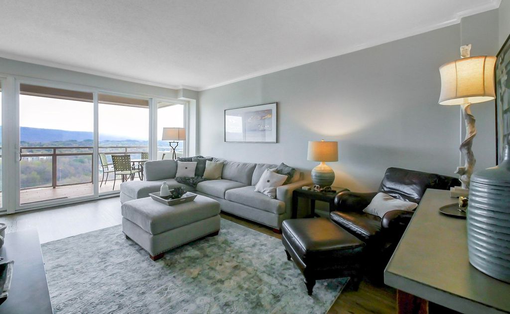 This completely remodeled, fully furnished 1 bedroom-1 bath condo, top floor unit with private balcony offers breathtaking mountainous views which serves as a beautiful backdrop to the downtown Chattanooga area. Open the door to 15-K and you will find numerous modernized features throughout this condo home. The spacious living area is large enough to accommodate a substantial sectional sofa and other accent furnishings. The original sliding glass doors have been replaced with insulated, vinyl clad doors. The kitchen is equipped with up to date white cabinetry, granite countertops, plus a sizable pantry. The primary bedroom has both a large walk-in closet and the bathroom features a custom tiled walk-in shower. The laundry room with your own private storage locker is only a few steps away. Included in the Pinnacle monthly HOA fees are all utilities, garbage collection, salt water pool, clubhouse, gym, movie theater, and outdoor grilling area. For pets 35 pounds and under, there is a designated pet area. 15 K comes with a covered parking space (#14) on the main level of the parking garage. There is also extra assigned parking areas in both the front and rear of the building for family, friends and guests. The Pinnacle residents are part of a community who recognize the need to add value through both previous and future and improvements. Recent updates and replacements include a new roof in 2019, upgraded air systems, enhanced fire safety, and planned upgrades in 2026 feature the completion of two new elevators, fresh exterior paint, and attractive updated hallways and lobby. The Pinnacle is conveniently located to an abundant number of shops, grocery stores, restaurants, medical and pharmacy facilities, along with indoor and outdoor activities-so much this nearby downtown living has to offer. This condo equipped with lovely furnishings is move in ready.