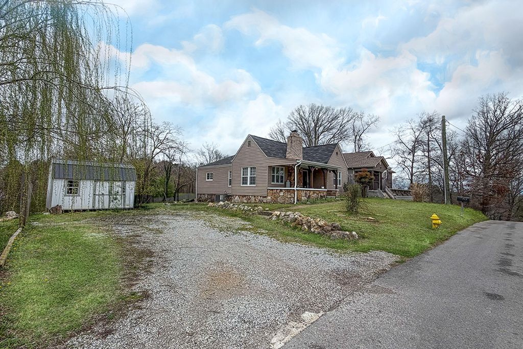 This charming 1935 hilltop cottage features a welcoming covered front porch with views reaching as far as the Three Crosses in Ooltewah. Its classic gabled roof and stone-veneer foundation blend vintage character with modern comfort. The 1,344 sq. ft., one-story residence offers 2 bedrooms, 2 baths, a walk-in pantry/laundry room, and inviting living spaces highlighted by vaulted and coffered ceilings. Significant updates prior to its April 2019 purchase include a new roof, kitchen cabinets and countertops, bathroom vanities, refinished original hardwood floors, new tile, stainless steel appliances, and a new hot water heater. The home offers a cozy yet functional layout. The stone fireplace has been converted to a smokeless (ventless) propane fireplace with a new firebox, and ceiling fans are installed in all rooms except the dining area. Historic charm is evident throughout, with original hardwood floors and large windows providing abundant natural light. Outside, enjoy a 3-car-wide gravel driveway, a back deck, and a paver patio lined with railroad ties, perfect for relaxing or entertaining. The backyard has been cleared of three large trees and several saplings and features a new metal chain-link fence with a wood privacy fence along the borders. Additional conveniences include a rainwater collection barrel, hot tub connections, and a fire hydrant in the front yard. The front door digital lock and rear keypad entry door provide easy access. Inside, the main bathroom features a walk-in shower, while the guest bathroom has a fiberglass tub/shower combination. Surrounded by new or recently updated homes, this property offers a rare opportunity for retirees or a small family seeking a blend of classic character, hilltop views, and modern comfort.